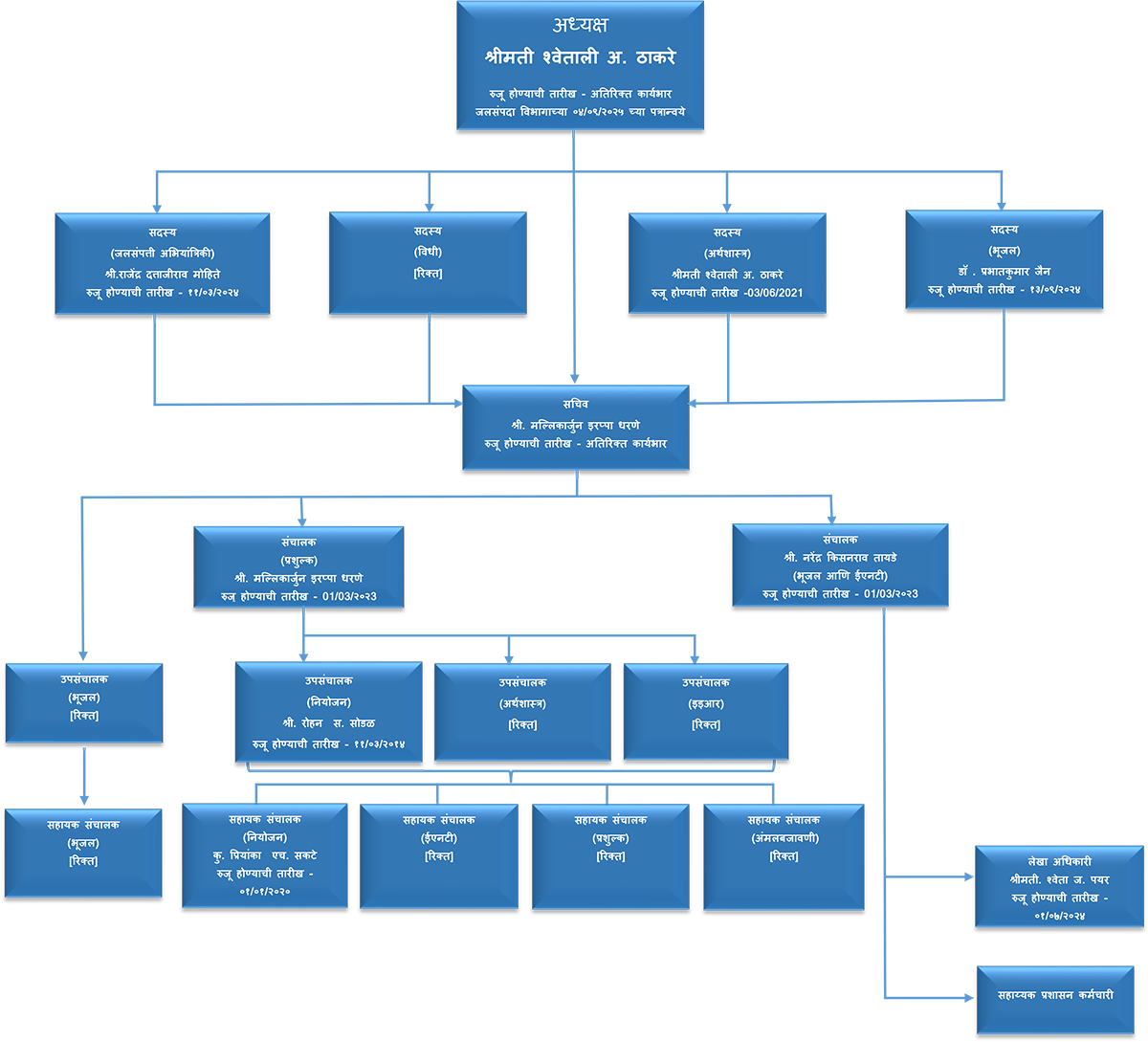 - अध्यक्ष, अतिरिक्त कार्यभार – श्रीमती. श्वेताली अभिजित ठाकरे, रुजू होण्याची तारीख – जलसंपदा विभागाच्या ०४/०९/२०२५ च्या पत्रान्वये